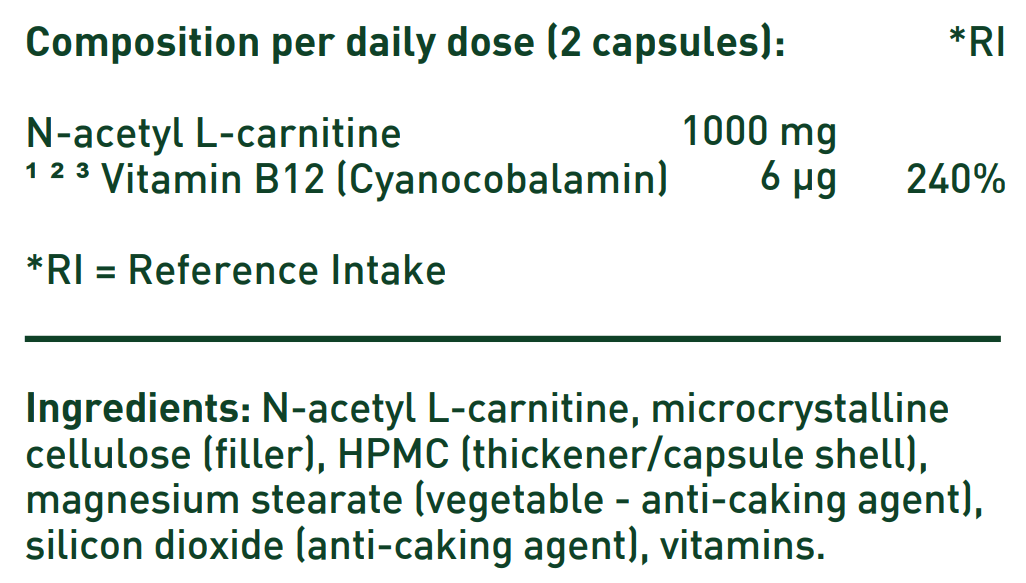 Contains 1000 mg Acetyl-L-Carnitine per daily dose and is produced according to strict quality standards.